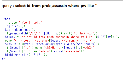 $query = "select id from prob_assassin where pw like '{$_GET[pw]}'";