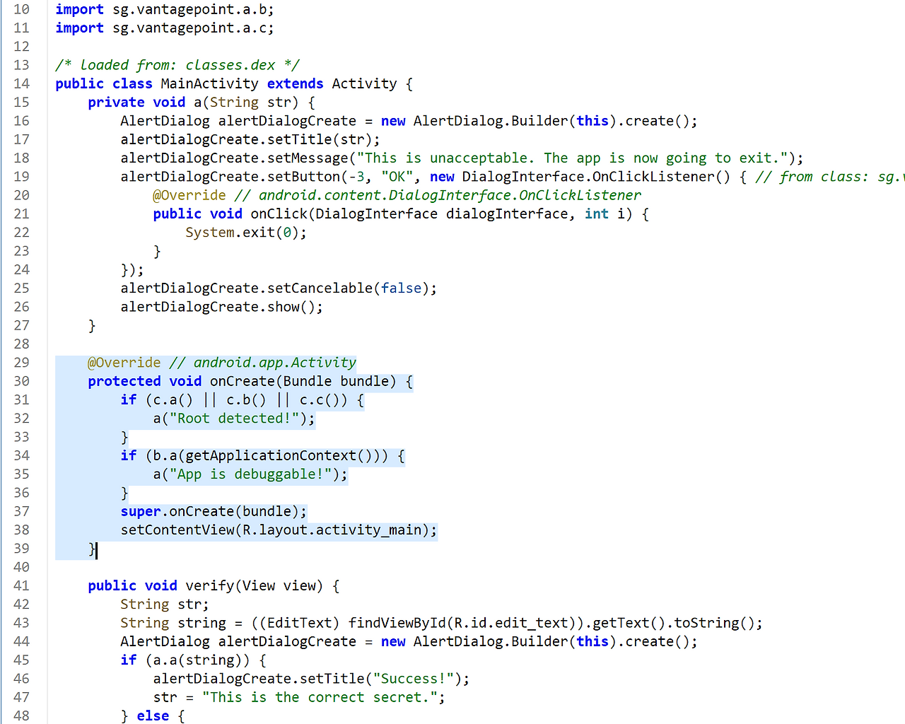 android:name="sg.vantagepoint.uncrackable1.MainActivity">- 액티비티 패키지 명이 쓰여있다. 이 패키지로 들어가본다.