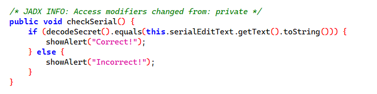 checkSerial() 함수는 decodeSecret의 값이 serialEditText 값과 같은지 확인하고 맞으면 Correct! 값을 알림으로 띄워주고 아니면 Incorrect!를 띄워준다.