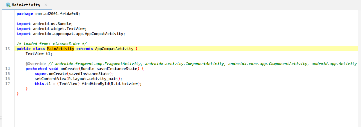 adb 상에 설치하고 MainActivity부터 시작해보나 특이점은 없어보이니 com.ad2001.frida0x4 클래스중 Check 클래스를 확인해준다.